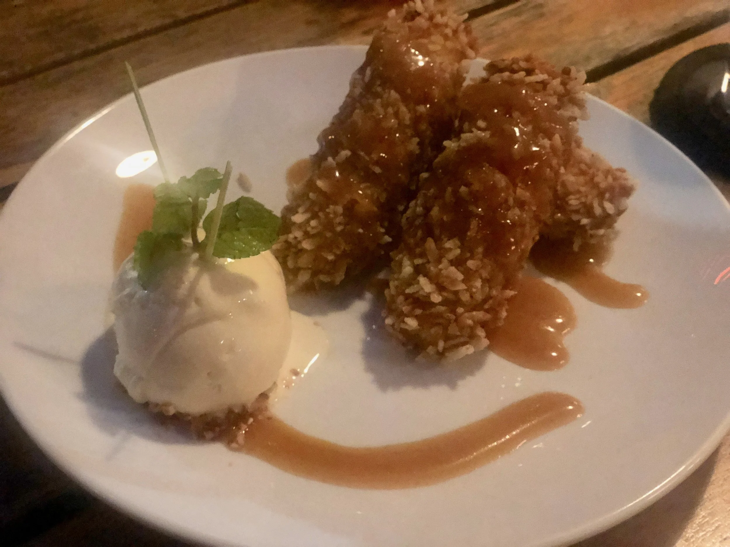 ● Sandan’s Banana Fritters: small sweet bananas fried and served with lemongrass galangal ice cream and a palm sugar caramel.